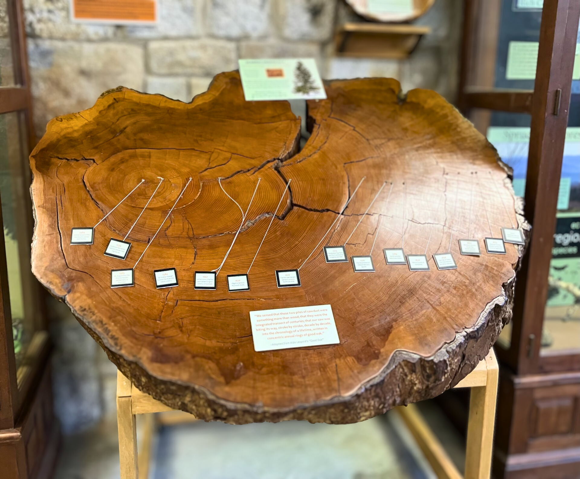 “The problem of marking the 439 rings to associate the tree with the history of this region and the nation was discussed. It was decided that the most feasible method would be to mark the rings with very small pin tags bearing numbers to correspond to a label with the tree’s history and political and general history.”