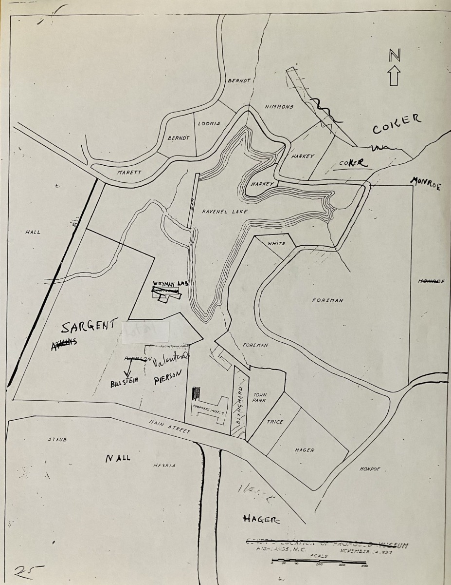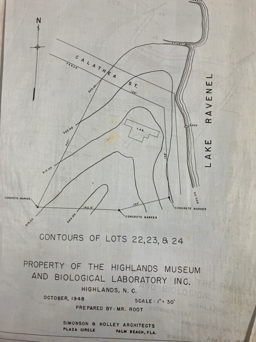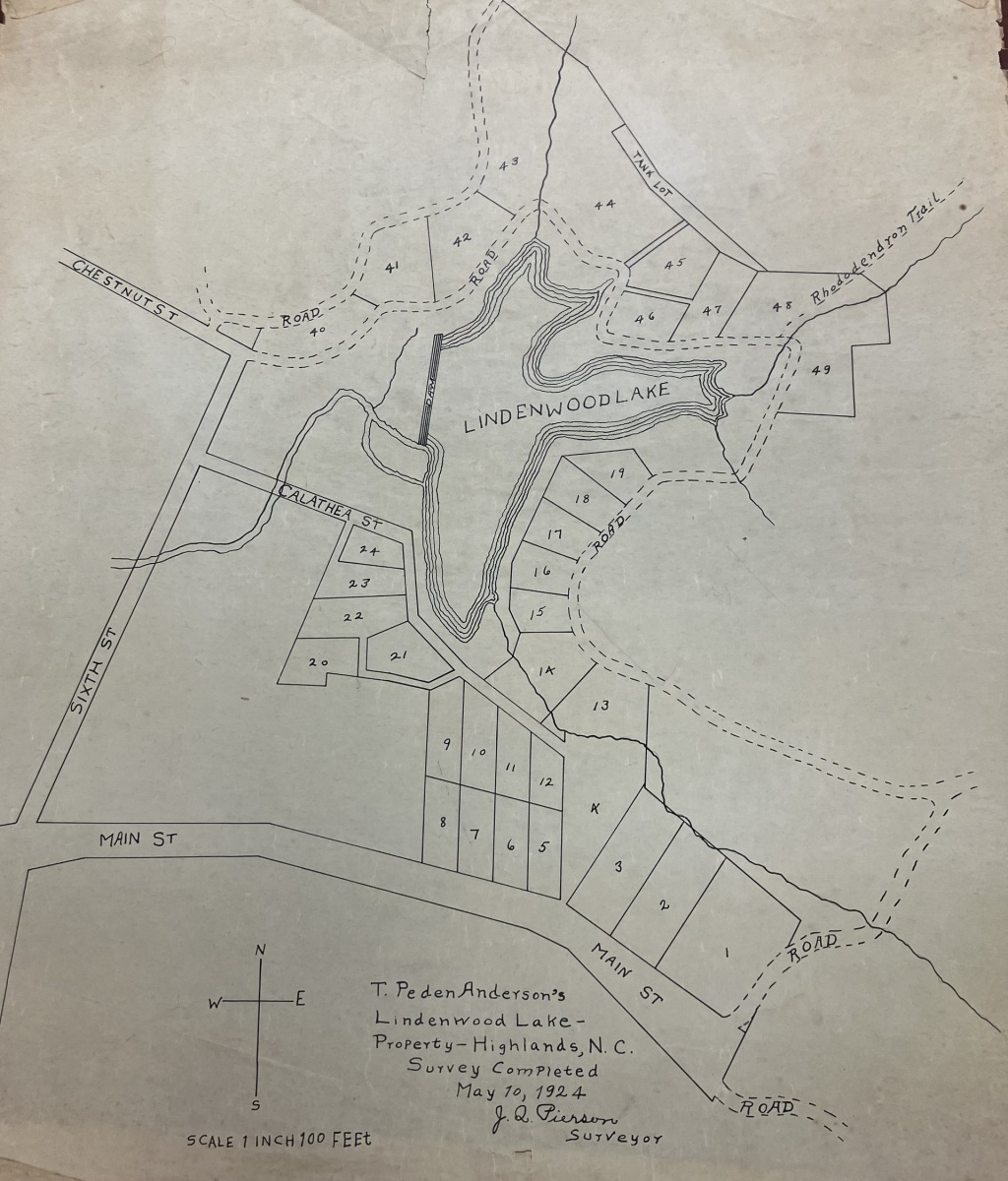 Highlands Biological Station sits in a landscape shaped by water. At its center is Lindenwood Lake—once known as Ravenel Lake—chosen in 1931 as the best location for the Station’s first laboratory. The surrounding property had been divided into lots in the early 1920s by developer Thomas Peden Anderson, based on a survey completed May 10, 1924 by J. Q. Pierson.