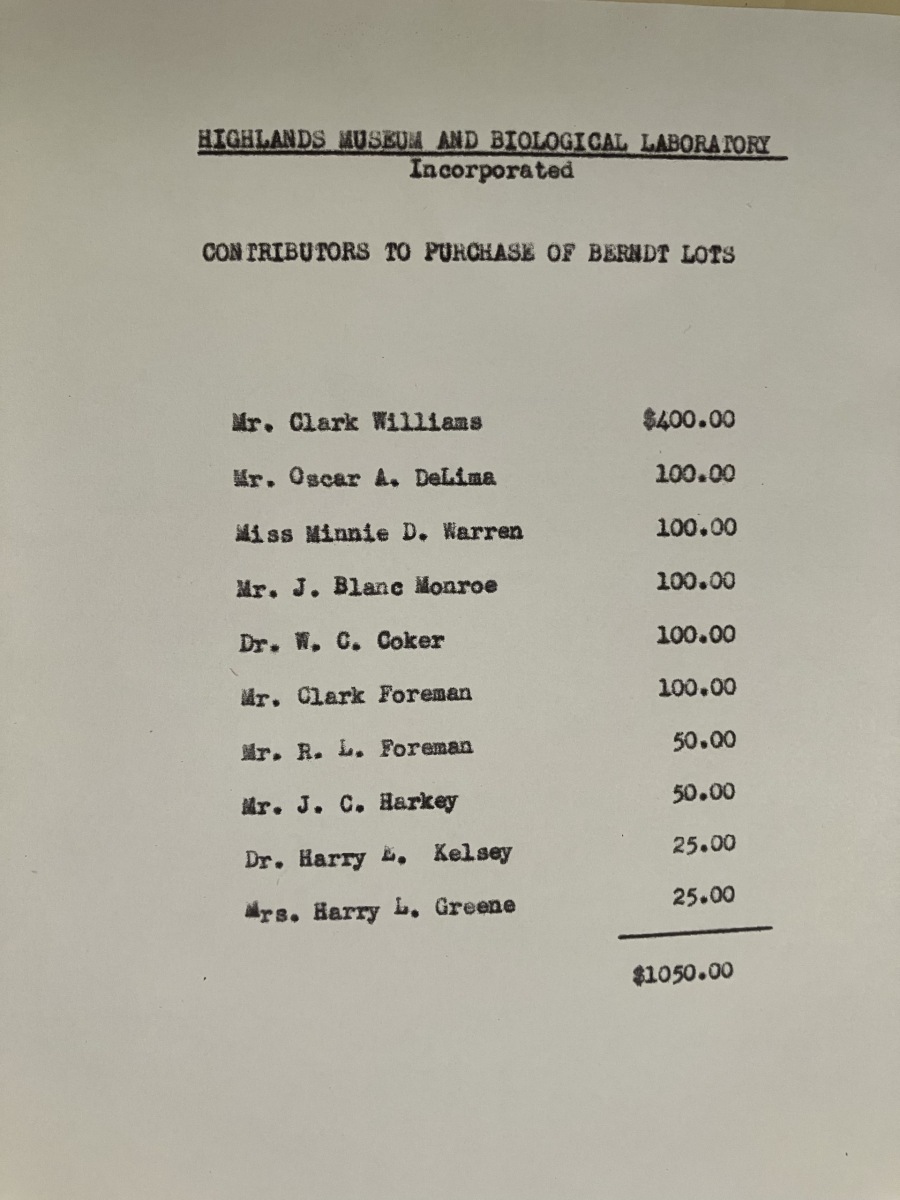 Originally conveyed from T. Peden Anderson and Pearl H. Anderson, these lots were transferred on September 1, 1925, to Julius E. E. Berndt and Susie M. Berndt. On December 15, 1936, the properties were acquired by Highlands Biological Station for $1,000.