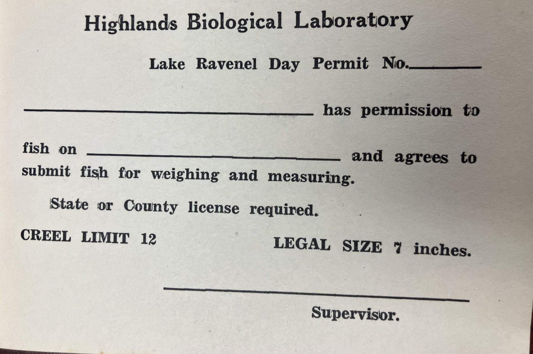 In August 1942, Trustees agreed to stock the lake with brook trout and adopted fishing regulations. A Lake Supervisor would determine fishing days and creel limits, and eligible fishing privileges were limited to defined groups associated with the Station and surrounding property ownership. The lake would be patrolled if funding could be raised.