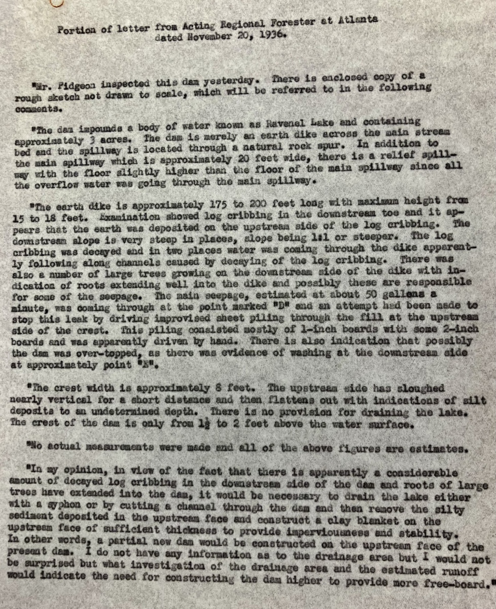 On December 17, 1931, Frank B. Cook submitted a small bill for labor on the dam after heavy rains produced “two or three very bad looking leaks.” In his letter, he wrote that he took the “bull by the horns” and acted immediately.