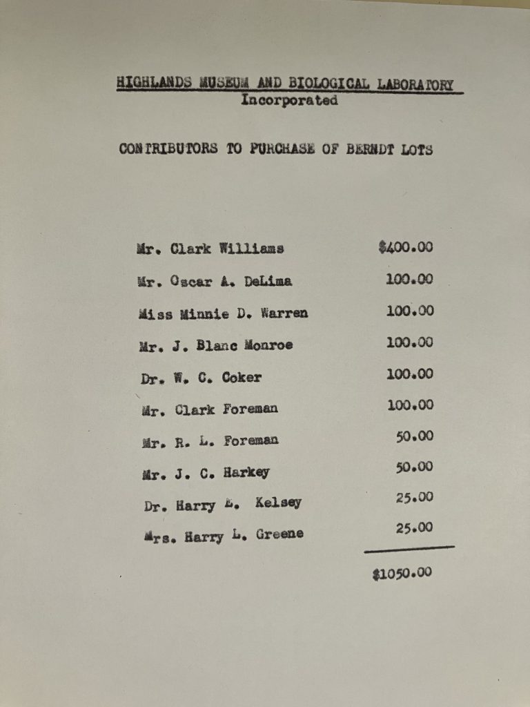 On July 15, 1961, Robert and Rosalie Mason White of Malibu, California, donated the property to Highlands Biological Station. The lot had previously belonged to Robert White’s mother, Mrs. Pacidia White of Thomasville, Georgia.