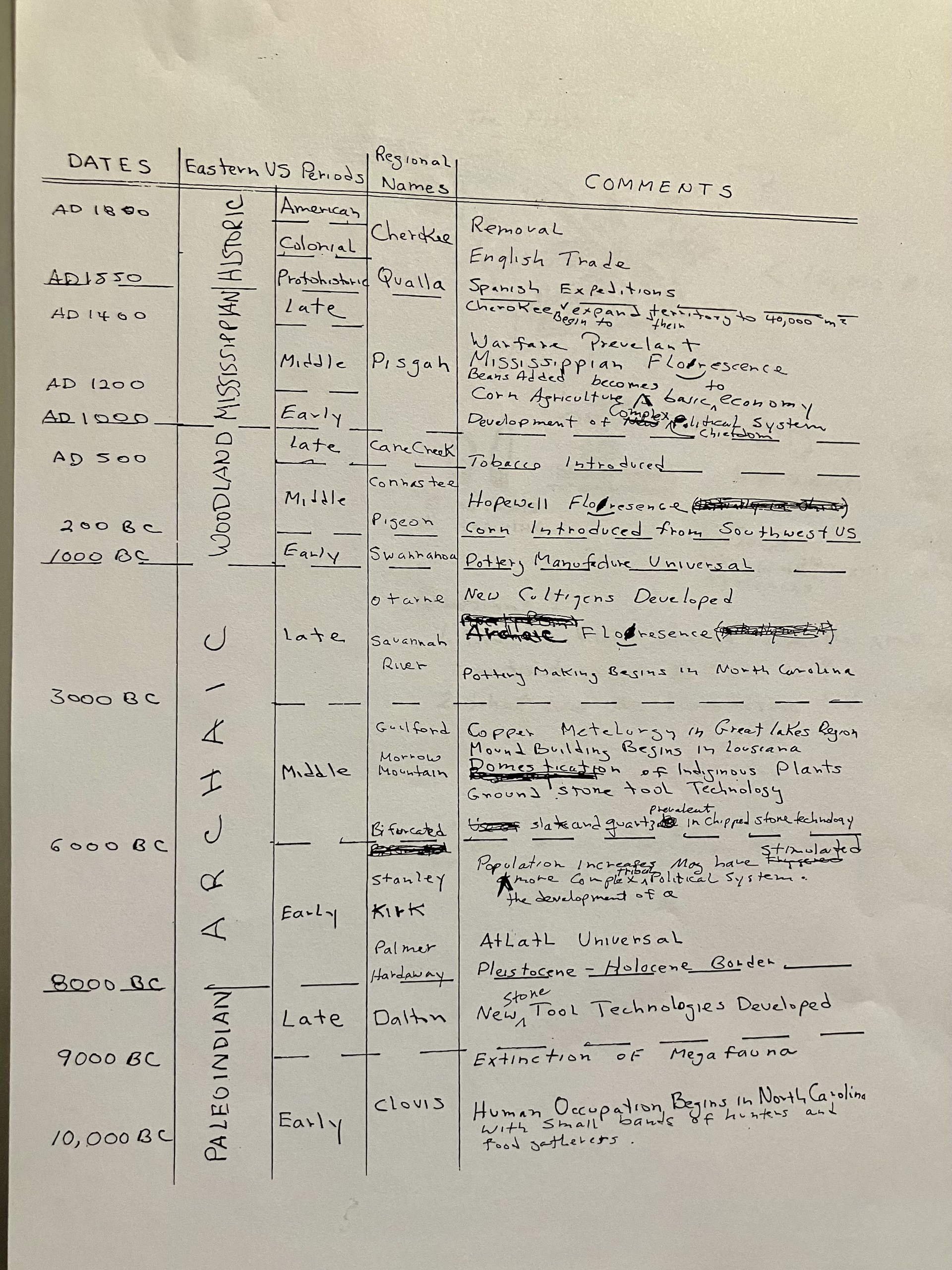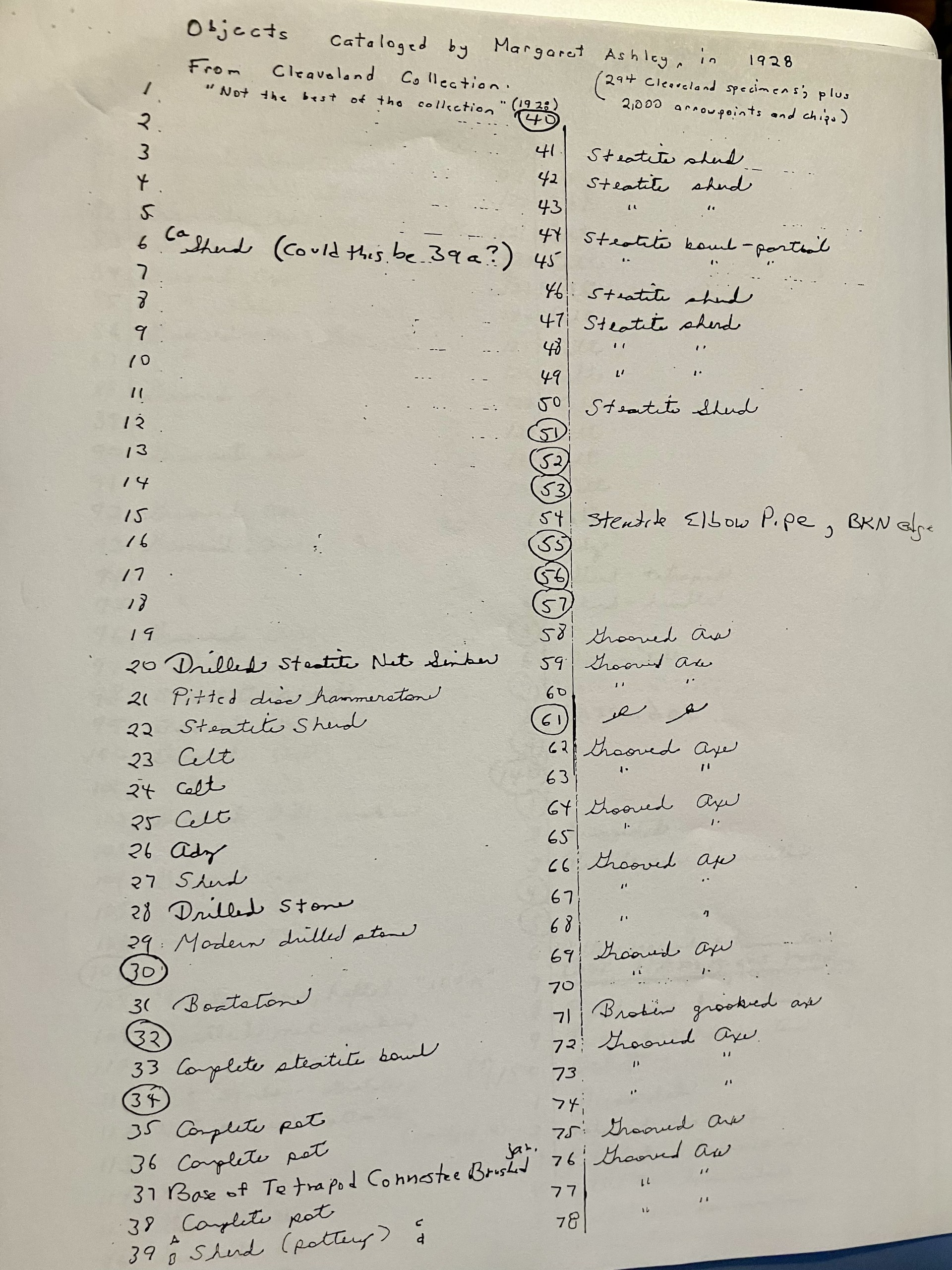 Margaret’s catalog of the Cleaveland Collection survives as a basic handwritten inventory, listing “294 Cleaveland specimens plus 2000 arrowhead points and chips – not the best of the collection 1928.” A four-page exhibit plan also survives and was partially implemented in the Highlands Biological Station (HBS) Nature Center.